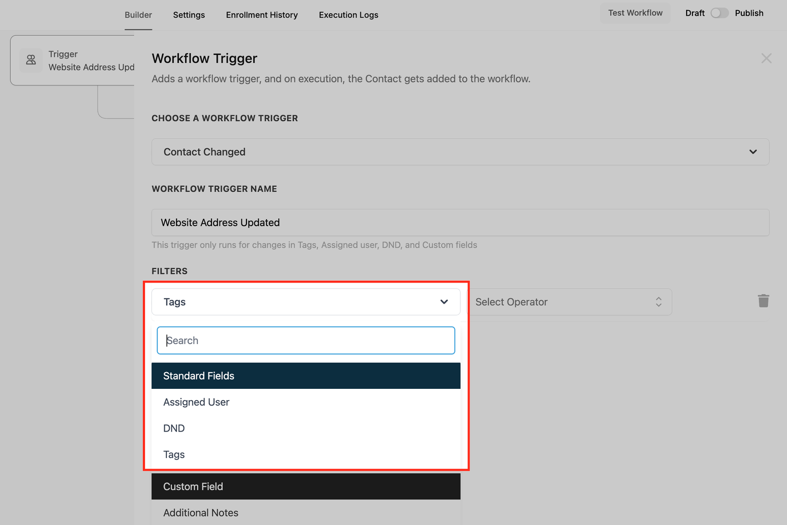 - Decide what kind of contact changes will activate the trigger. Select Custom Field if you want to track changes in a specific field like “Website.” Choose Tags if you want the workflow to react to added or removed tags. Use DND if the workflow should respond to changes in the “Do Not Disturb” setting.