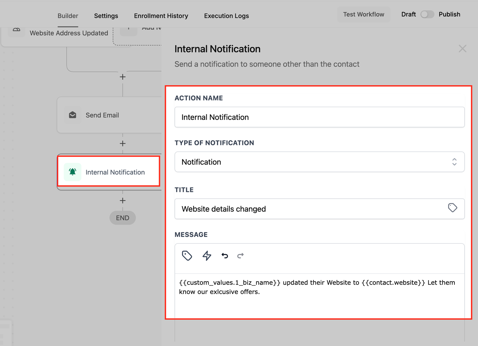 - Action Type: Internal Notification. Message: “Contact {{contact.first_name}} has updated their business website. Follow up soon.”