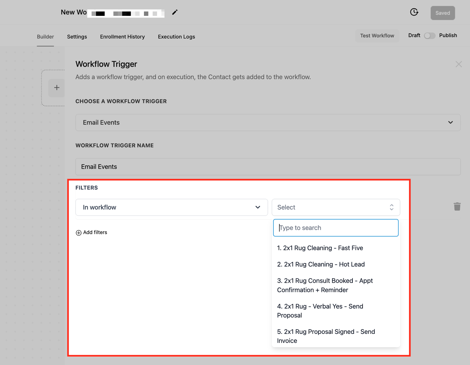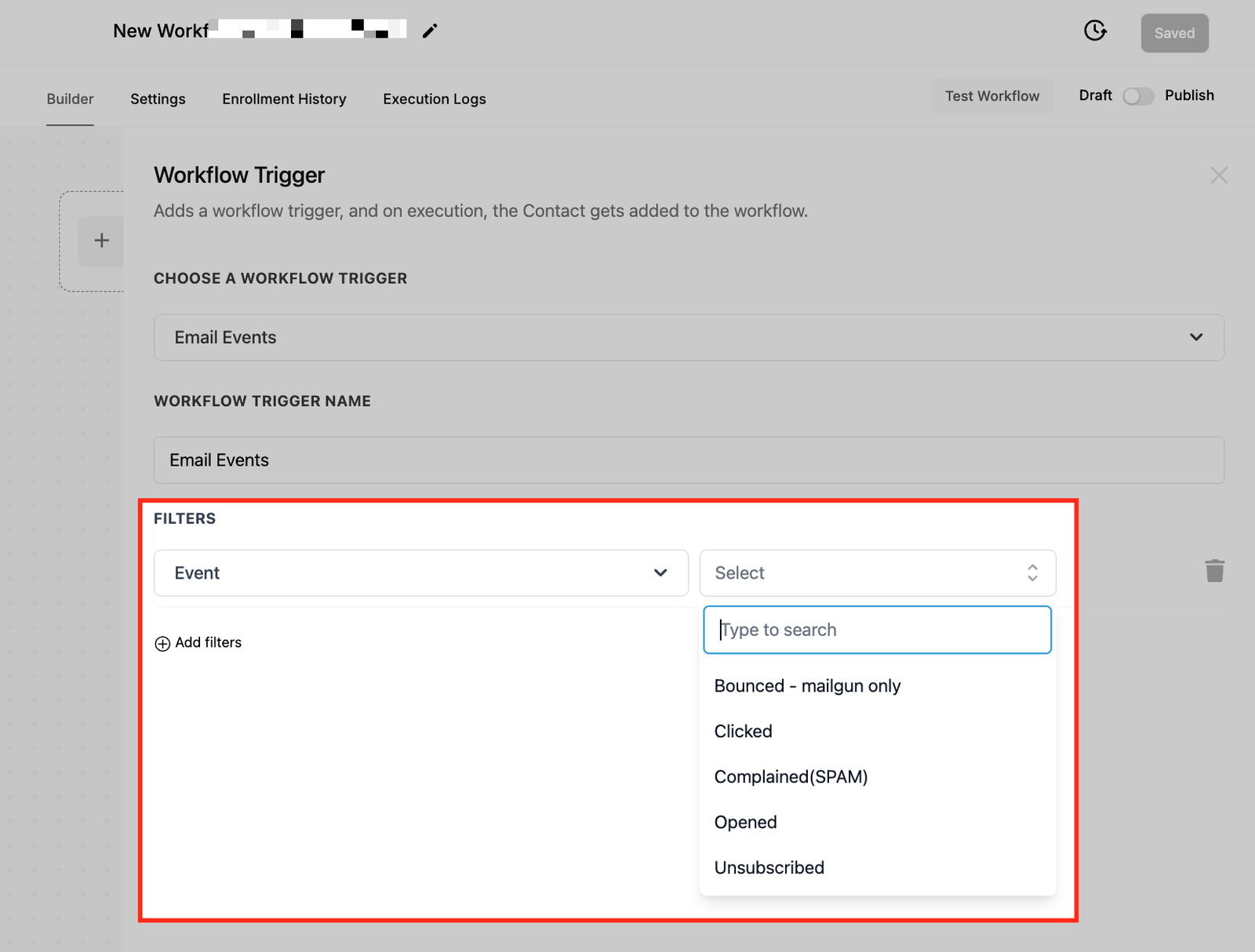 Filters play a crucial role in refining when the Email Events Trigger activates, ensuring that your workflows are only triggered by relevant email interactions. The two primary filters—Event and In Workflow—allow you to define specific conditions under which the trigger should run.