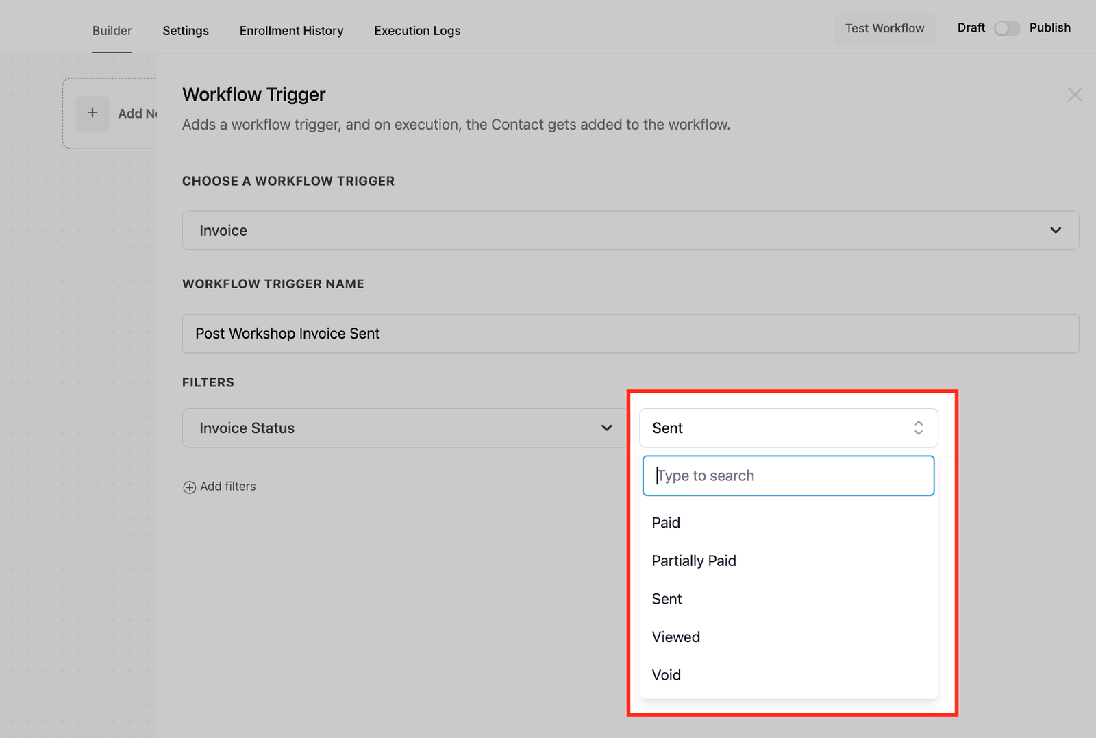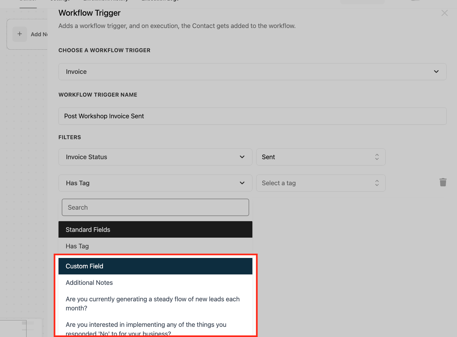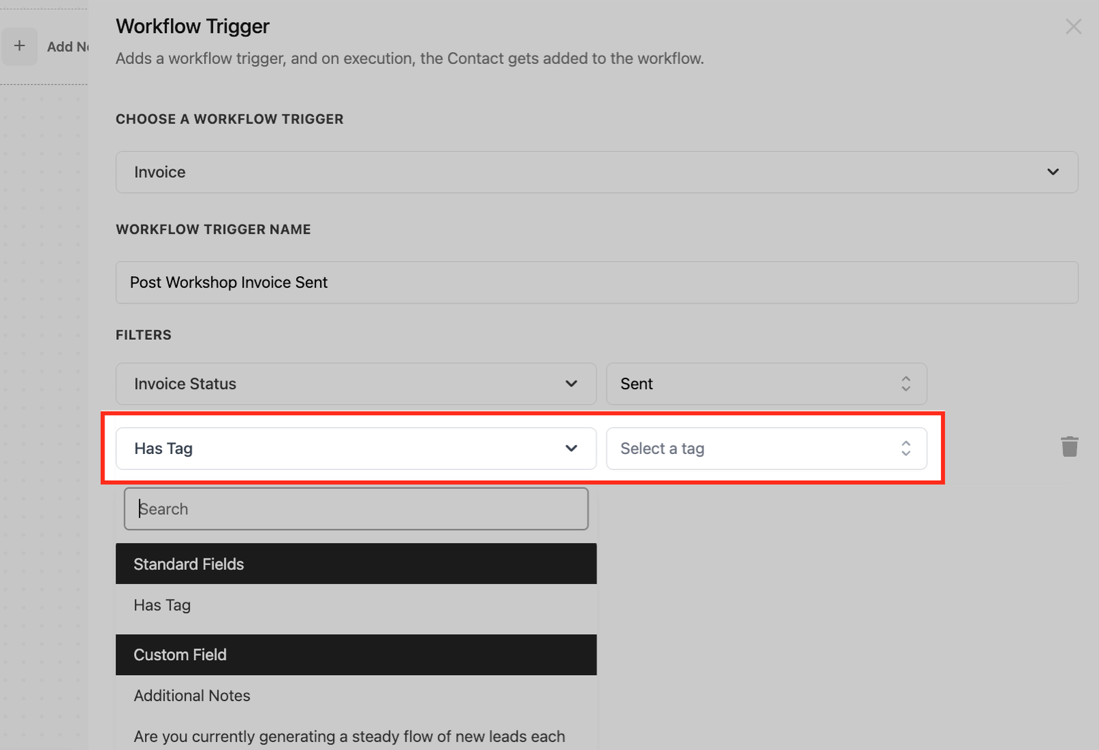 In addition to the Invoice Status Filter, you can further refine your workflows using “Has Tag” filter and Custom Fields. These filters allow you to create more precise automation by narrowing down the trigger conditions based on specific criteria.