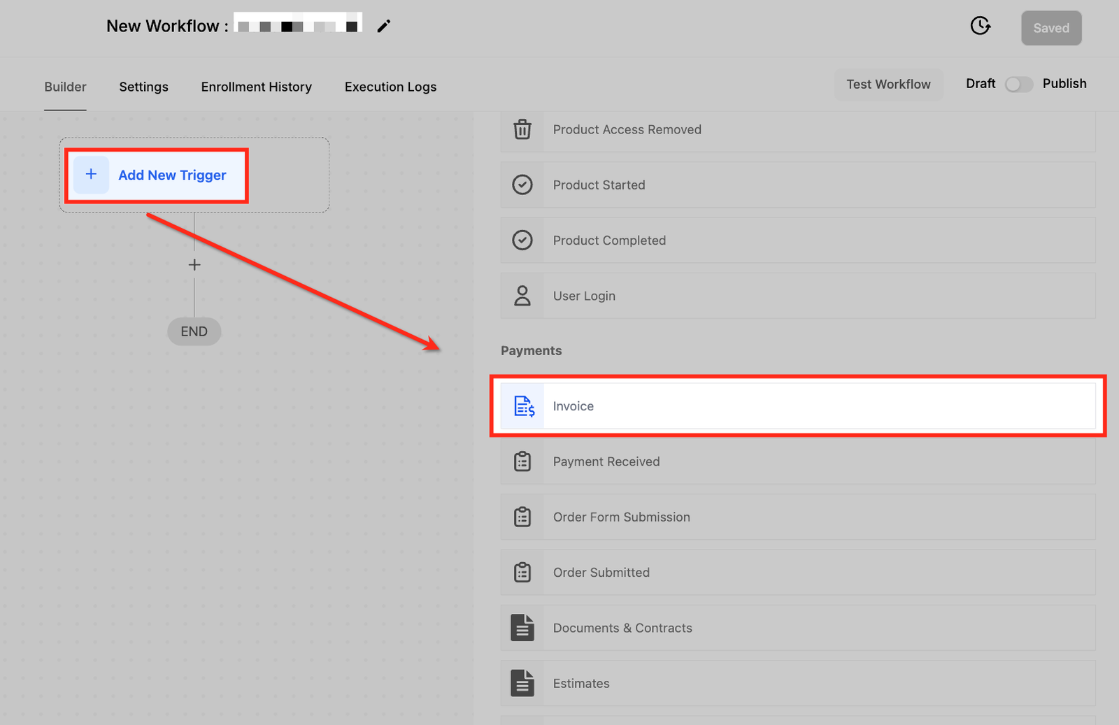 Access the “Automation” section of your platform and create a new workflow or select the existing workflow where you wish to apply the Invoice trigger.