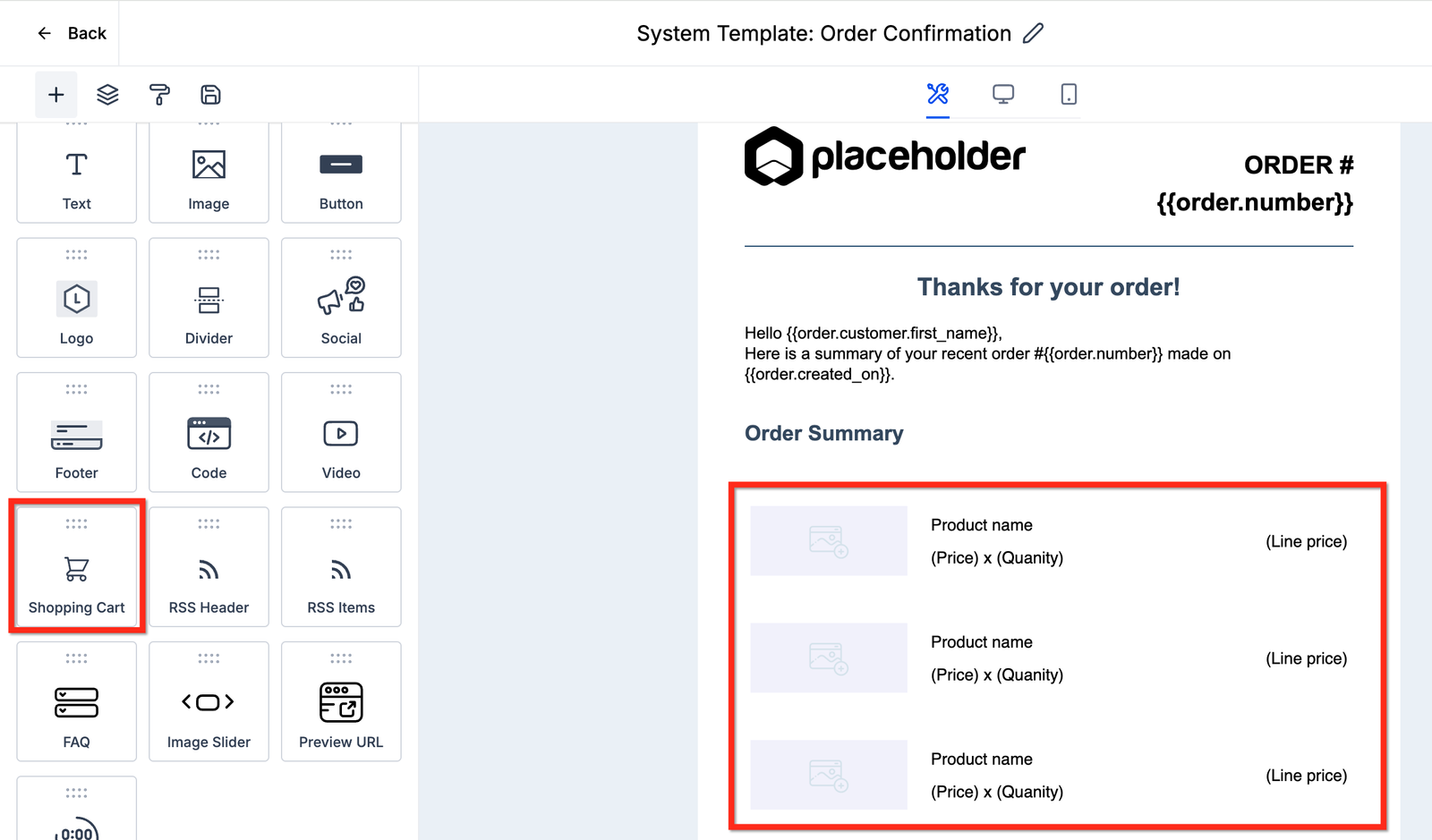 - Shopping Cart: When the Order Submitted values are available, the Shopping Cart element added in the Email Template builder will automatically populate that templatewith the item details from the order.