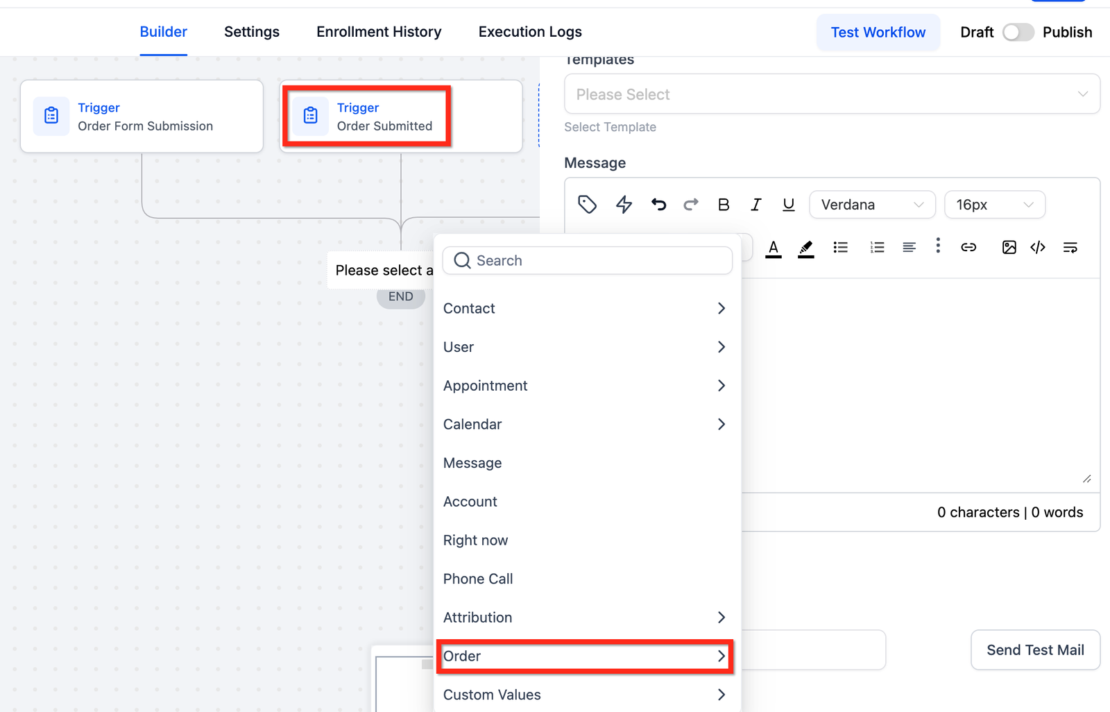 - Available Values:There are values related to the Order that are only available in the workflow if the Order Submitted trigger is present.