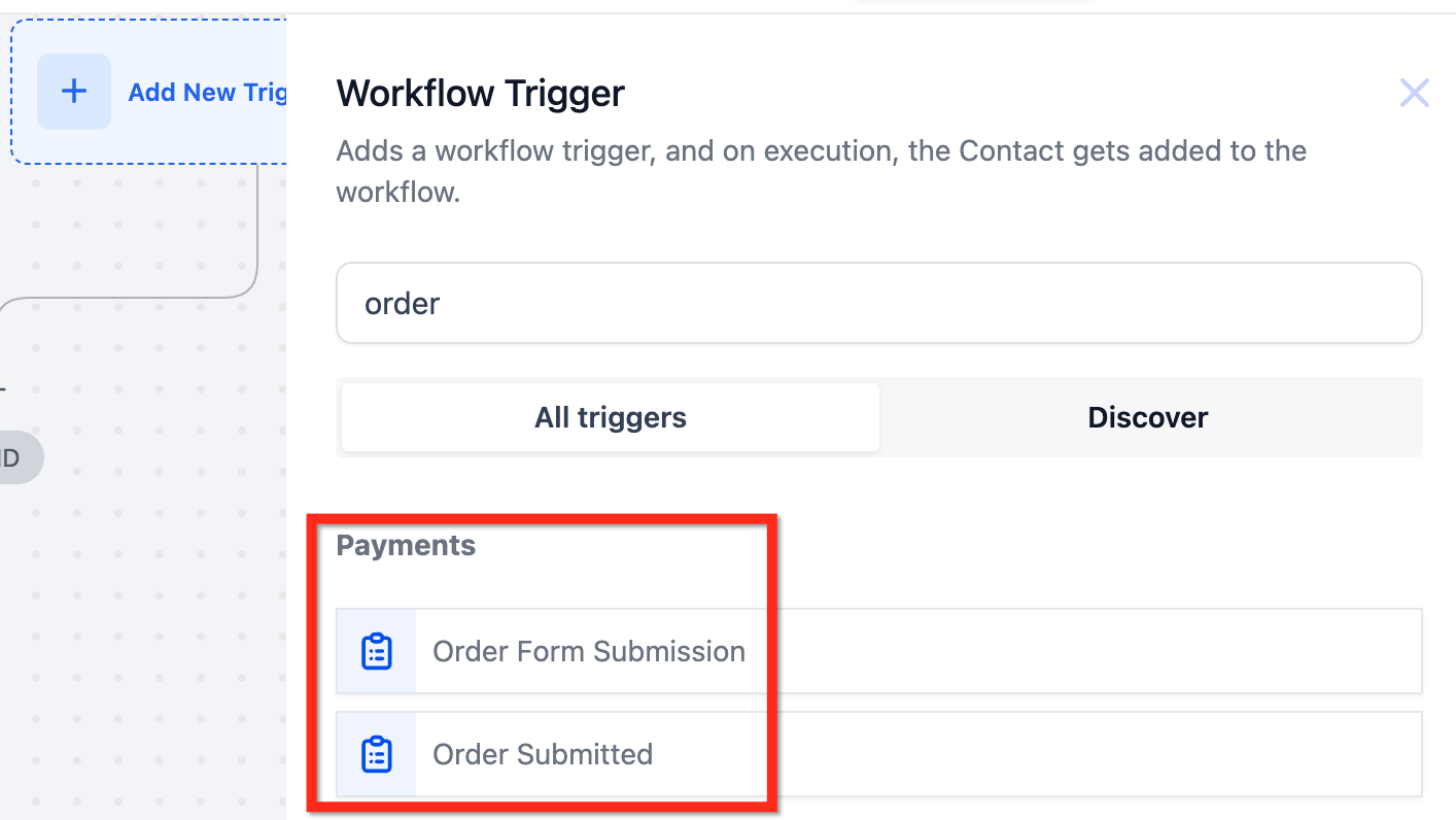 The Order Form Submission and Order Submitted triggers are in the Workflow Builder under Payments.