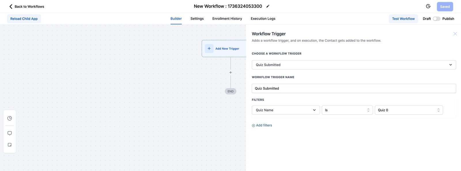 - Specify which quiz submissions activate the trigger by setting filters for quiz names, scores, or custom fields.