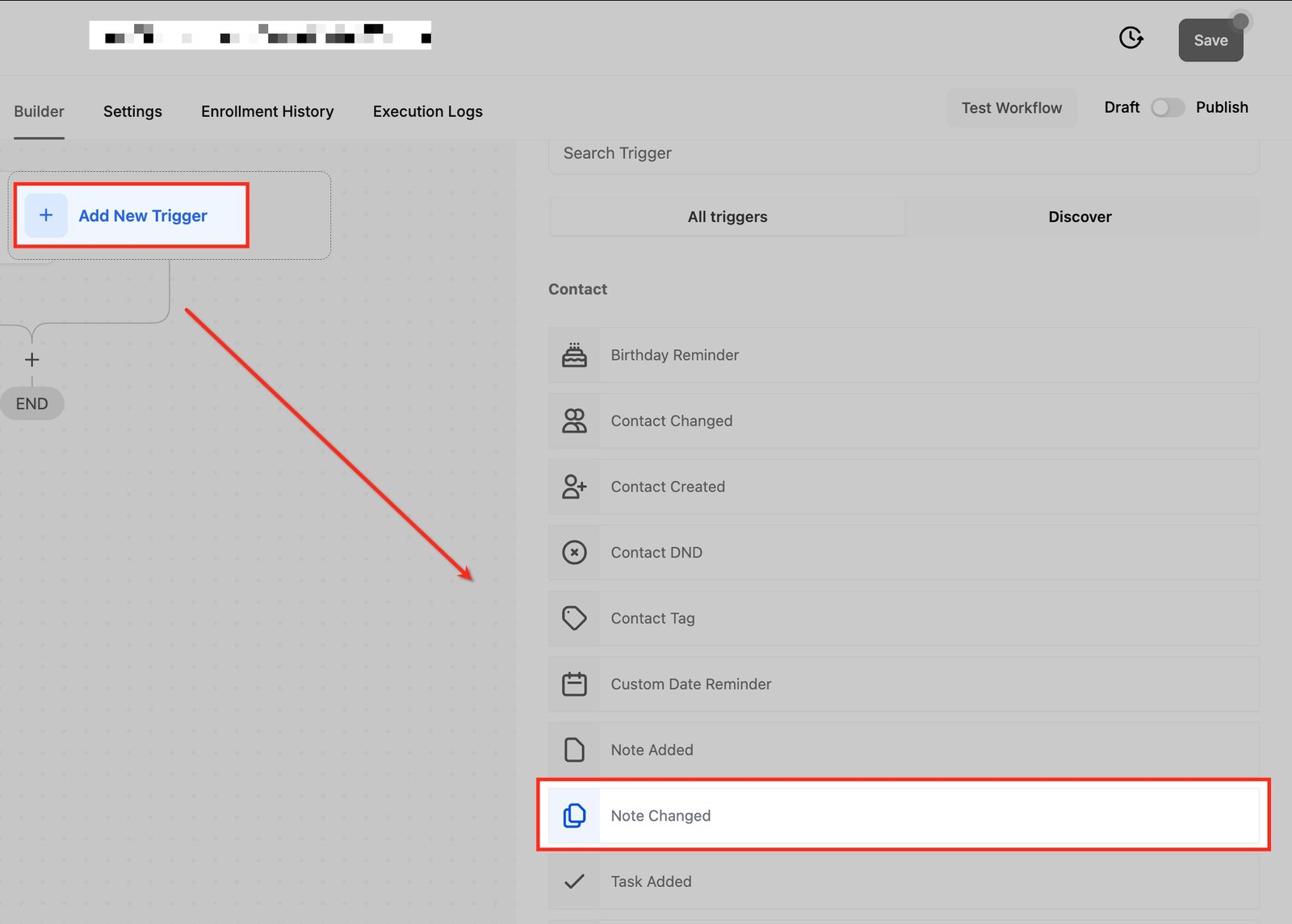 From the available options, choose the Note Changed trigger under the Contact section.