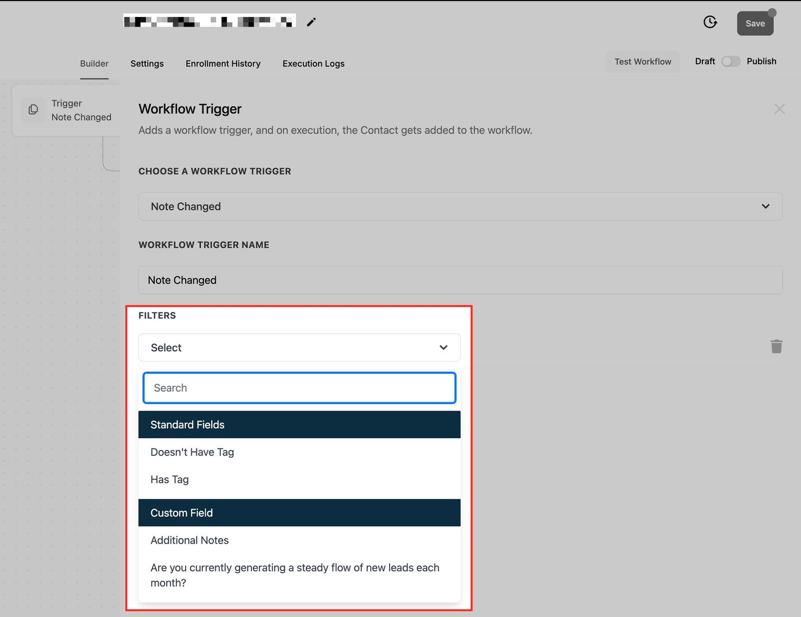Currently, the trigger applies to all note changes in a contact record. You can use filters like “Has Tag” or “Doesn’t Have Tag” to refine the workflow’s scope based on the type of contact.