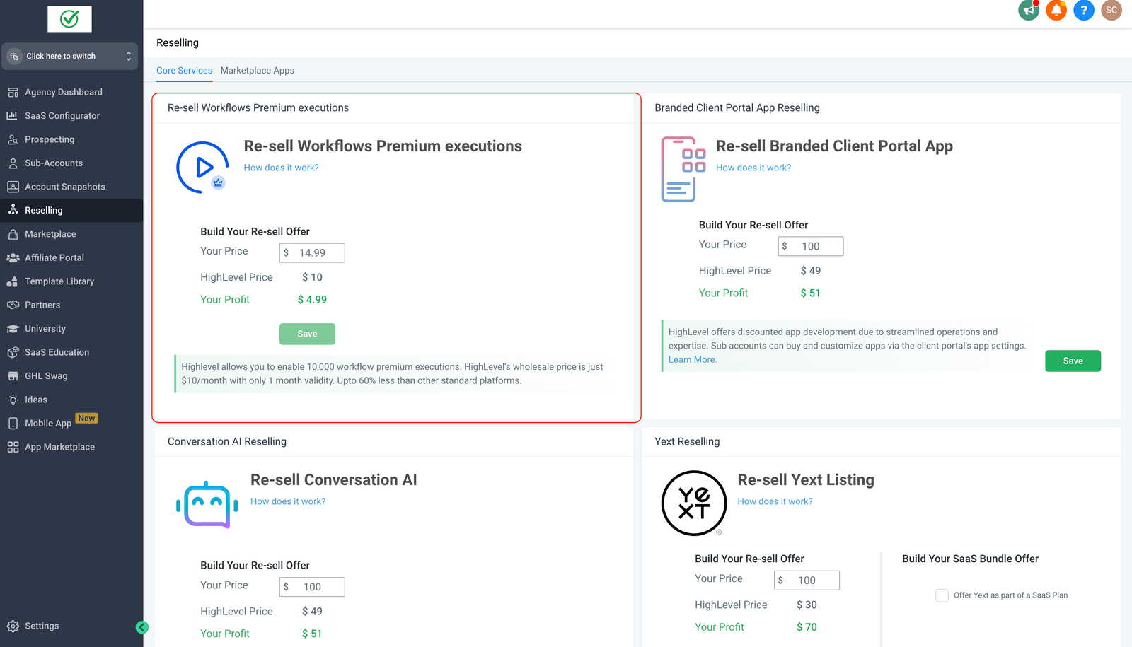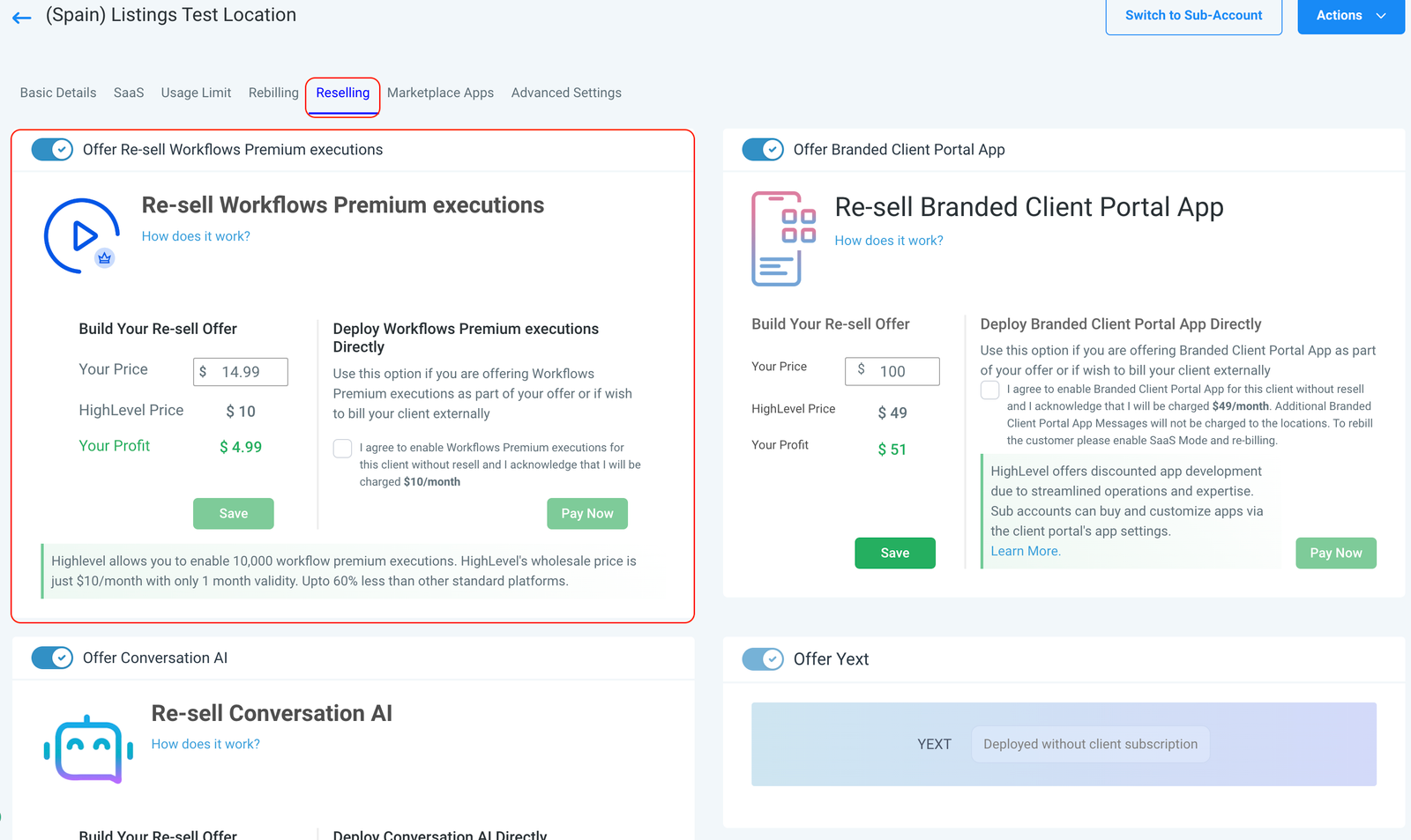 Agencies can resell their locations from the agency settings page. Default price is $10.