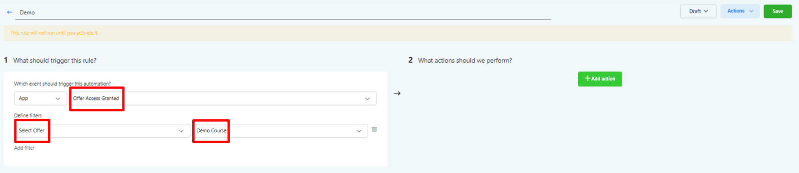 NOTE: You may want to define the filters by clicking “add filter” in order to specify which product/offer your trigger applies to. If you just set up Part 1 “Offer Access Granted” to fire off an action in Part 2, this will apply for any offer. If you add a filter and choose a specific product/offer, the trigger will only run for that specific product or offer.